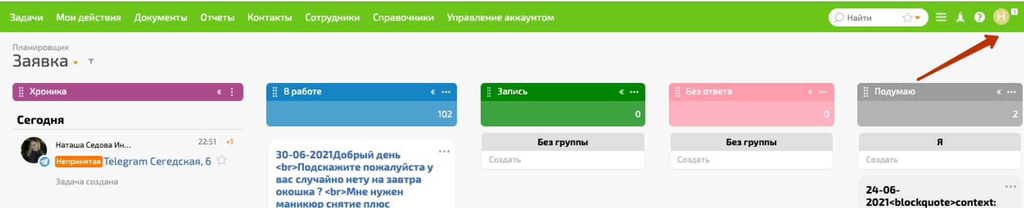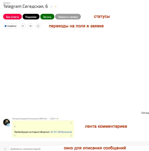 Вона має свої статуси («Без відповіді», «Подумаю», «Запис», «Закрити заявку»), зберігає інформацію про попереднє листування з клієнтом та чек-листи. Останні можна використовувати як нагадування, де фіксуються підзадачі: що та кому зробити.